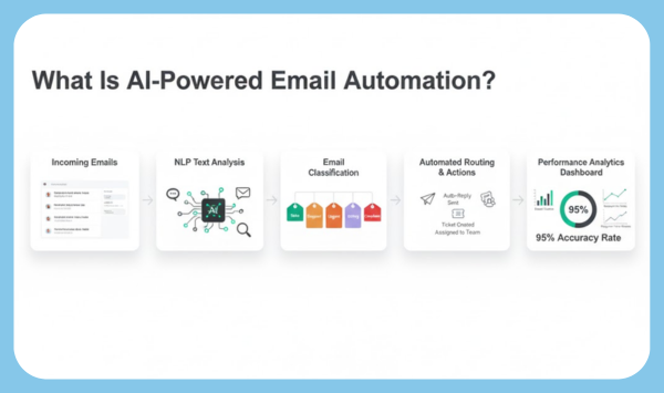 AI-powered email automation uses Artificial Intelligence (AI), Natural Language Processing (NLP), and Machine Learning to automatically read, understand, classify, and route incoming emails without manual effort.