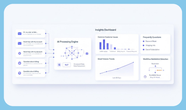 Common customer issues, email volume trends, frequently asked questions, and workflow bottlenecks are extracted and structured for actionable insights.