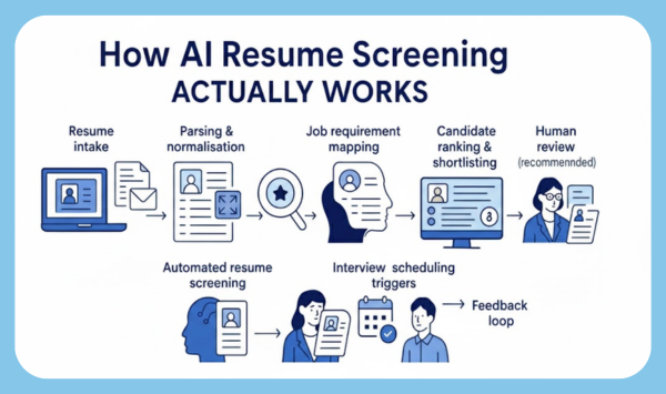 AI resume screening uses artificial intelligence to automatically read, analyze, and shortlist resumes based on job requirements such as skills, experience, and education.